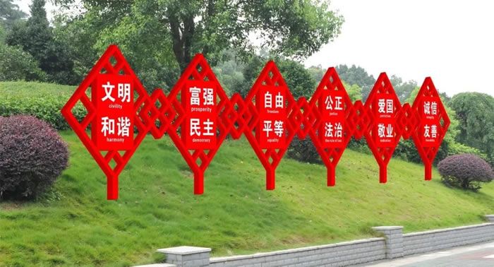 社会主义核心价值观标牌从严格意义上来说并不隶属于传统意义上的标识牌,因为它更多的是对一种特定精神的宣传和弘扬。我们都知道社会主义核心价值观具有传统风格的标识标牌,具有古典风格,独特靓丽,既能推进社会主义精神文明建设的进程,也给城市增添了一份美感。那么下面标识标牌制作公司给大家解析一下核心价值观的设计特点: